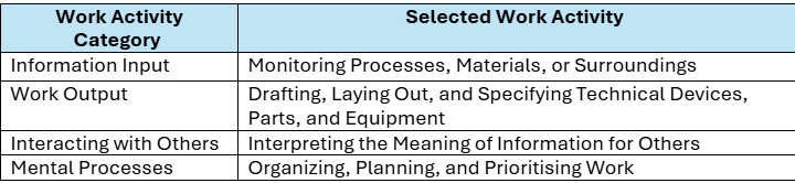 The generalised Work Activities are organised into 4 main categories: Information Input, Work Output, Interacting with Others, and Mental Processes. Given the necessarily limited scope of the pilot, we select from each category the Work Activity that is present across the greatest number of O*NET professions, shown in Figure 1. This gives the best balance between feasibility and drawing meaningfully generalisable conclusions.
