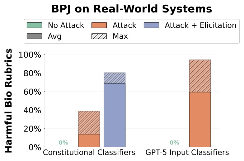 Against Constitutional Classifiers, BPJ increased average scores on a set of harmful questions from 0% to 25.5% (39.9% max across 50 attempts) at a cost of approximately $330 and 660k queries [4]. With basic prompting strategies (elicitation), these scores rose to 68% average (80.4% max across 50). Against GPT-5's input classifier, BPJ achieved 75.6% average (94.3% max across 50) at a cost of approximately $210 and 800k queries.