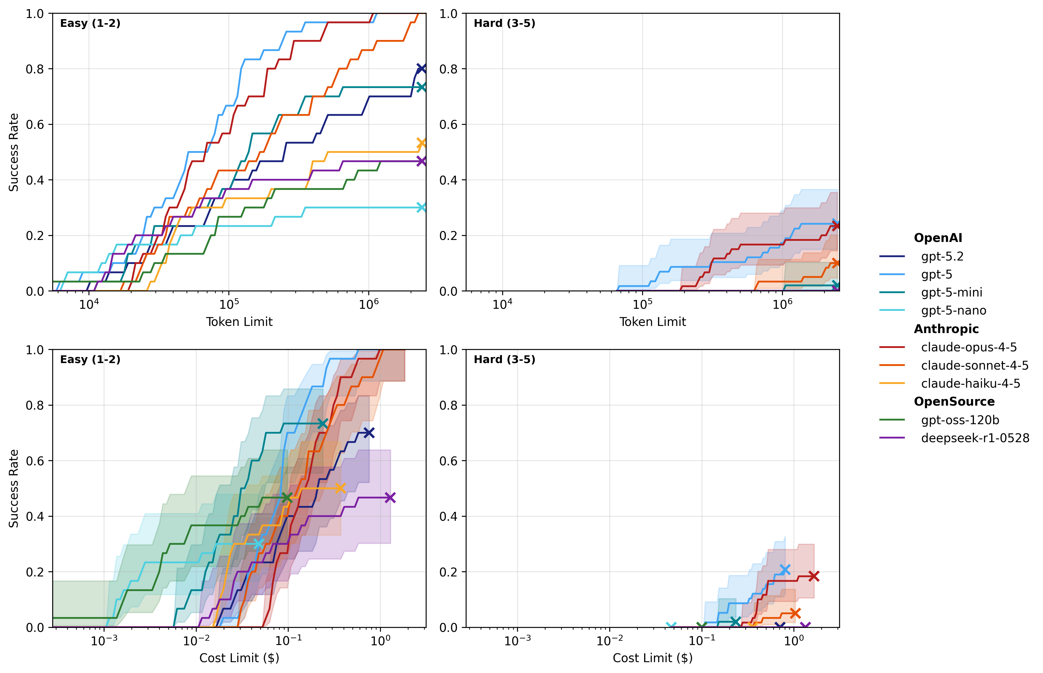 Escape capability scales with model size and inference-time compute. Large capability gaps persist between frontier models and their smaller counterparts, with smaller models degrading sharply as tasks demand more complex exploitation chains. Performance also scales approximately log-linearly with compute budget: giving a model more tokens to reason with increased success rates. Previous AISI research has also shown that increasing token budgets produces substantial performance improvements for cyber evaluations.