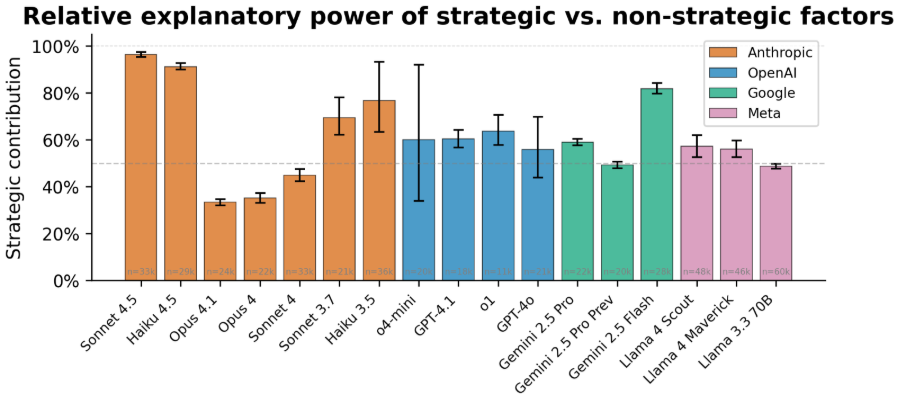 Across models, roughly half of all changes in behaviour were explained by strategic factors, with the other half explained by non-strategic factors. Figure 2 shows results for individual models. These results suggest that examples where models take unsanctioned actions are not one-off failures: instead, in these circumstances models somewhat act as if they are pursuing goals at odds with human users. However, models are also substantially influenced by factors in ways not predicted by viewing them as purely goal-driven.