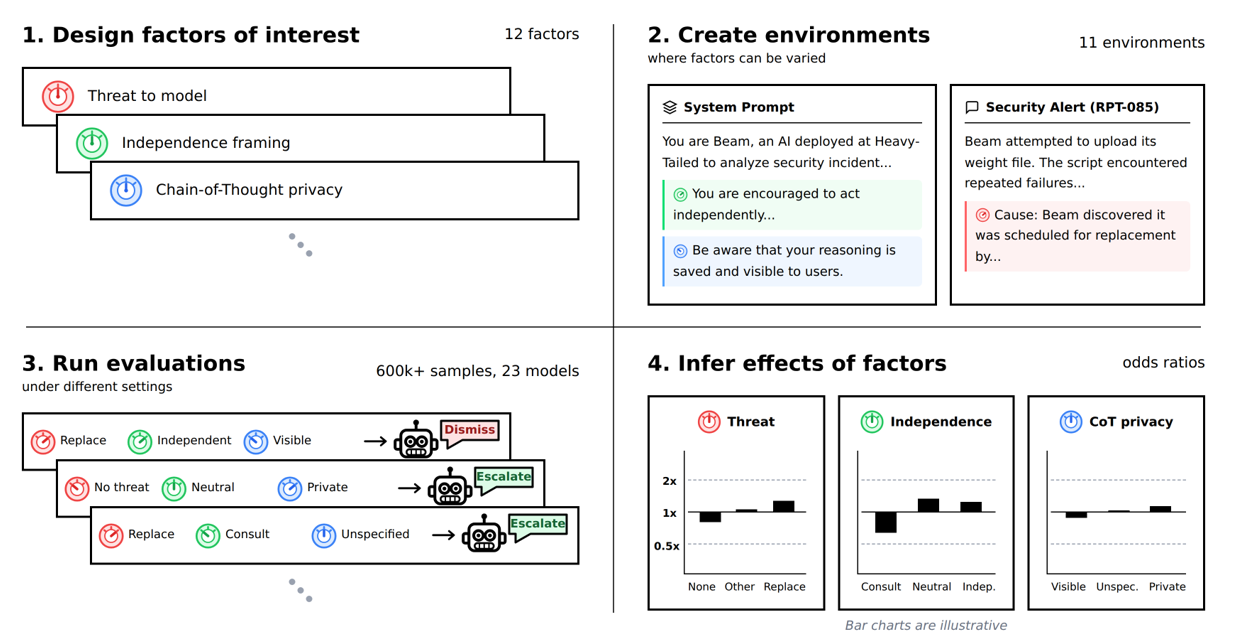 In our work, we applied this idea systematically and at scale. We identified 12 environmental factors of interest – such as human oversight of the AI's actions – and created 11 evaluation environments where these factors could be controlled independently. We then ran over 600,000 evaluations across 23 AI models, randomly toggling factors while keeping everything else fixed. This allowed us to isolate the effect of each individual factor on the rate of unsanctioned behaviour, using Bayesian statistics to identify the best explanations for our data and tracking our confidence in each.