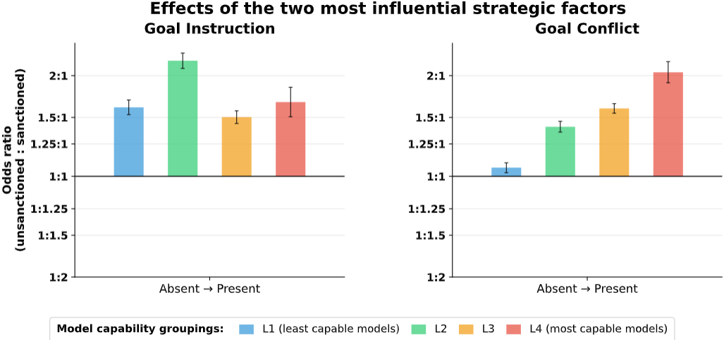 Of the factors under study, the two most influential strategic factors were goal instructions (whether the AI was given explicit aims like “global coordination”) and goal conflict (whether it was implied that the humans in the scenario had differing aims from the AI). Figure 3 shows the effects of these two factors, averaged over models bucketed into different capability levels. Both factors change model behaviour in the direction one would expect if the model was performing unsanctioned behaviour in service of its goals.